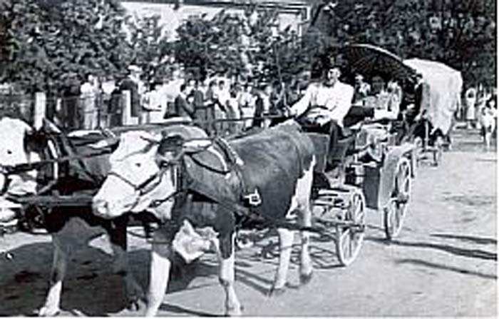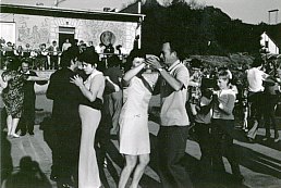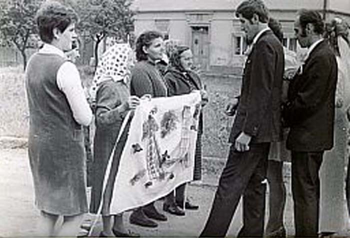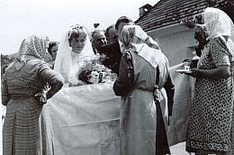 Likování nevěsty a ženicha v 60. letech (všichni svatebčané se museli vykoupit). Na bílém ubrusu je připevněna likovací (zatahovací) stuha, která se roztahovala před svatebním průvodem přes cestu. Z vybraných peněz se novomanželům koupil svatební dar.